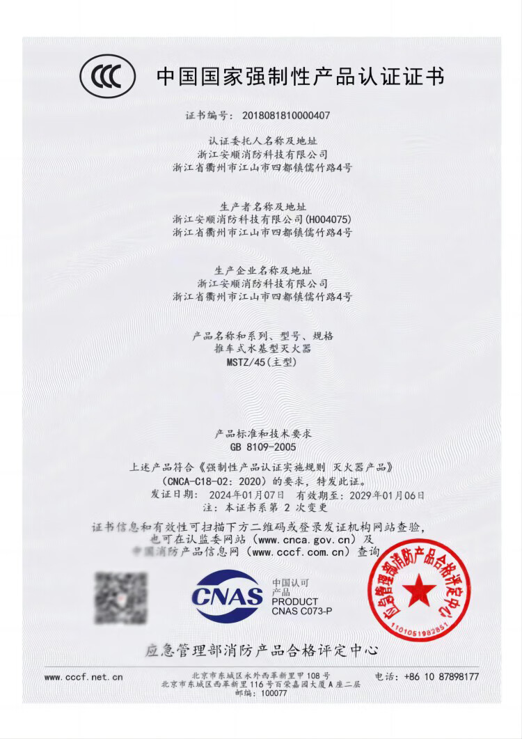 5 安全保障:通过消防装备质量监督检验中心检测,符合GB8109-2005标准,获得CCC认证,品质有保障。
