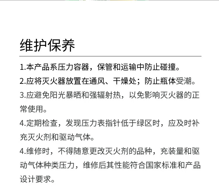 4 维修保养:不得随意更改灭火剂种类和充装量,维修后须经专业检测合格方可使用。