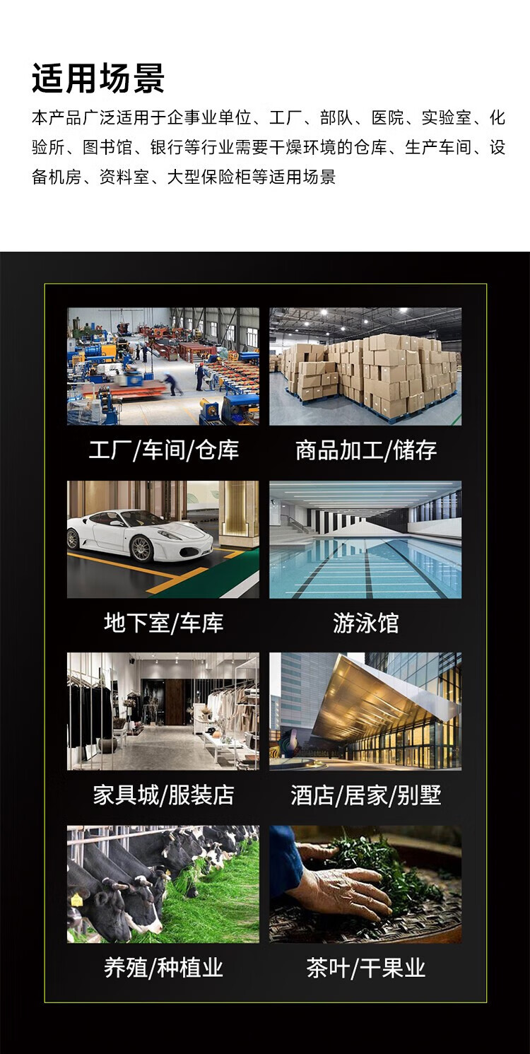 该除湿机广泛适用于多种工业和商业环境,如工厂车间、仓库、地下室、车库、档案室等需要干燥环境的场所。在工厂车间,它能有效防止设备因潮湿而生锈或损坏;在仓库中,它能保护库存商品免受潮气侵害,延长保质期;在地下室和车库,它能创造舒适的居住和停车环境;在档案室,它能防止文件资料受潮霉变。此外,该产品还适用于酒店、居家、别墅等民用场景,提供健康的生活空间。在养殖和种植业中,它能调节环境湿度,促进动植物健康成长。