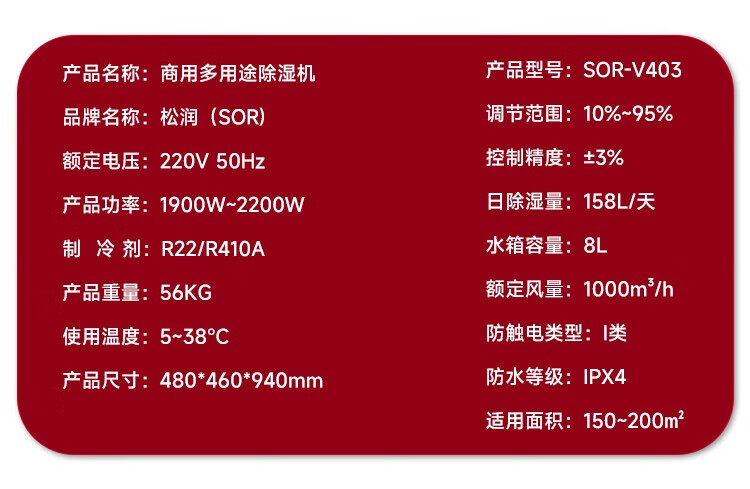松润/SOR 大功率商用除湿机 大除湿量低噪音智能款 仓库地下室车库档案室车间用 SOR-V403[158L /天 200m²]