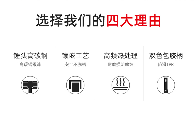 5 特殊嵌入工艺处理:锤头与手柄连接处采用特殊嵌入工艺,安全不脱柄,确保使用过程中的安全性。
