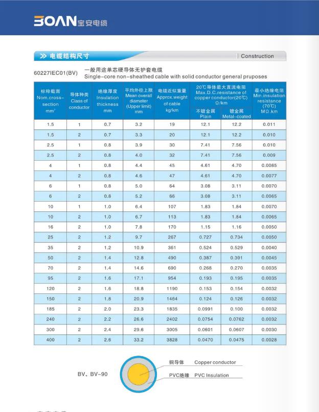 BOAN/宝安电缆 BB ZR-BV-450/750V-1x1.5是一款高性能的铜芯聚氯乙烯绝缘阻燃C级布电线。