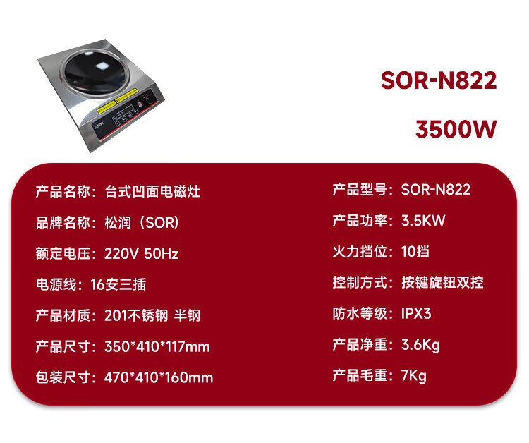 松润/SOR 商用电磁炉电磁灶大功率爆炒凹面电炒炉炒菜电炉汤炉 SOR-N822台式凹面[220V 3.5KW]
