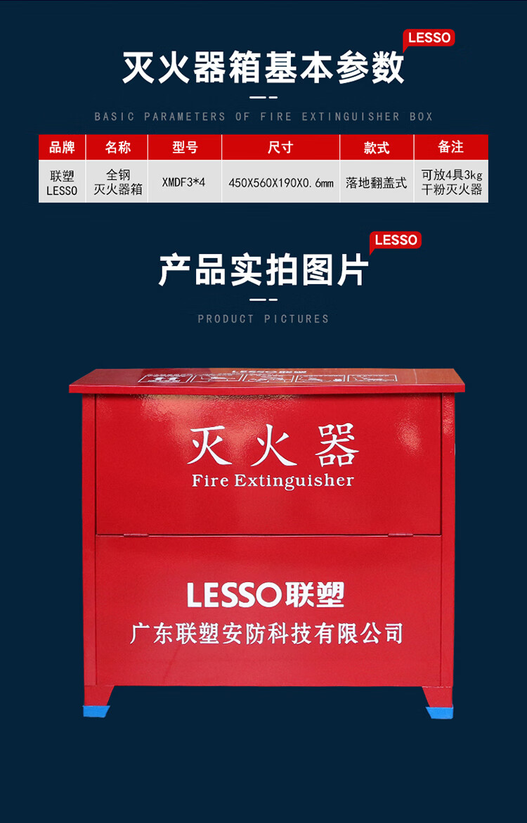 4 容量大:尺寸为450×560×190mm,可放置4个3kg干粉灭火器,满足多种消防需求。