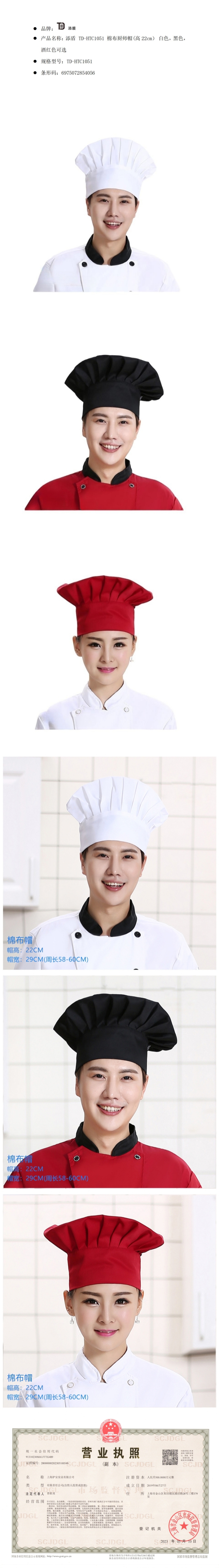 添盾 TD-HTC1051 棉布厨师帽(高22cm) 白色,黑色,酒红色可选TD-HTC1051
