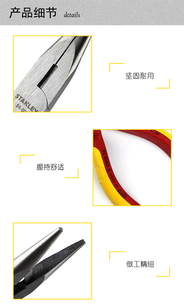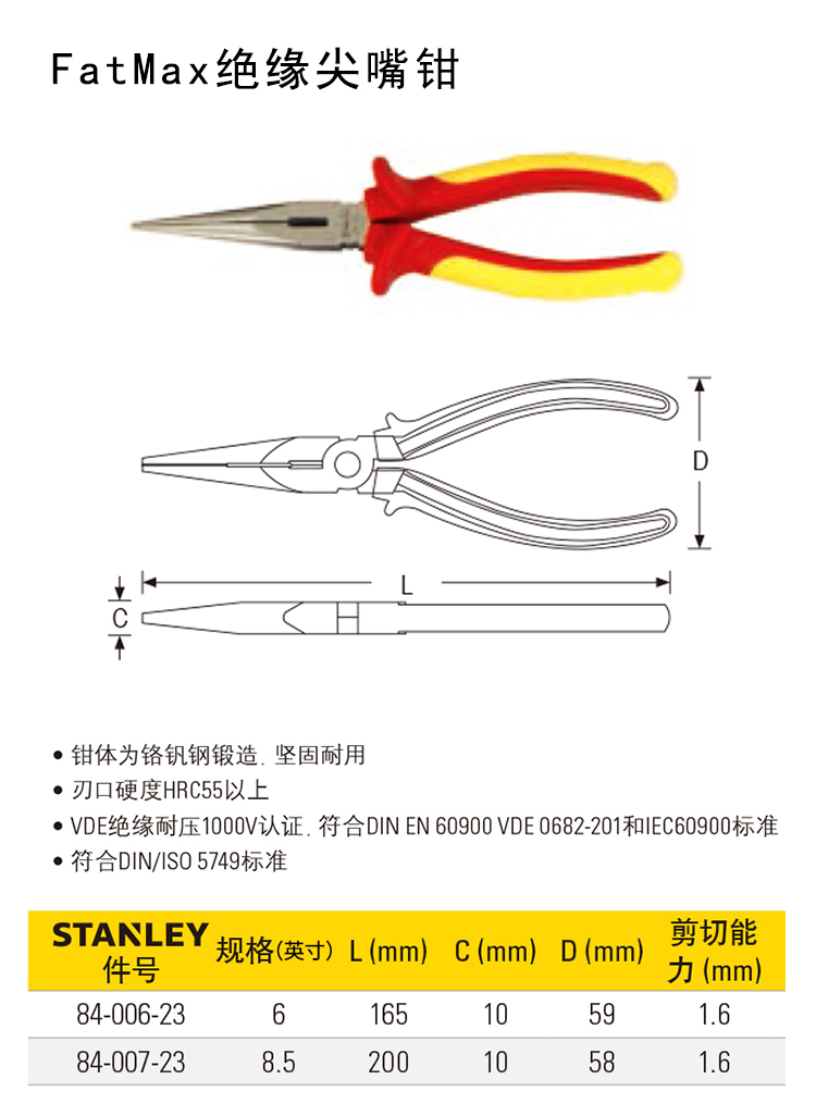STANLEY(史丹利)绝缘尖嘴钳84-006-23具有以下特点: