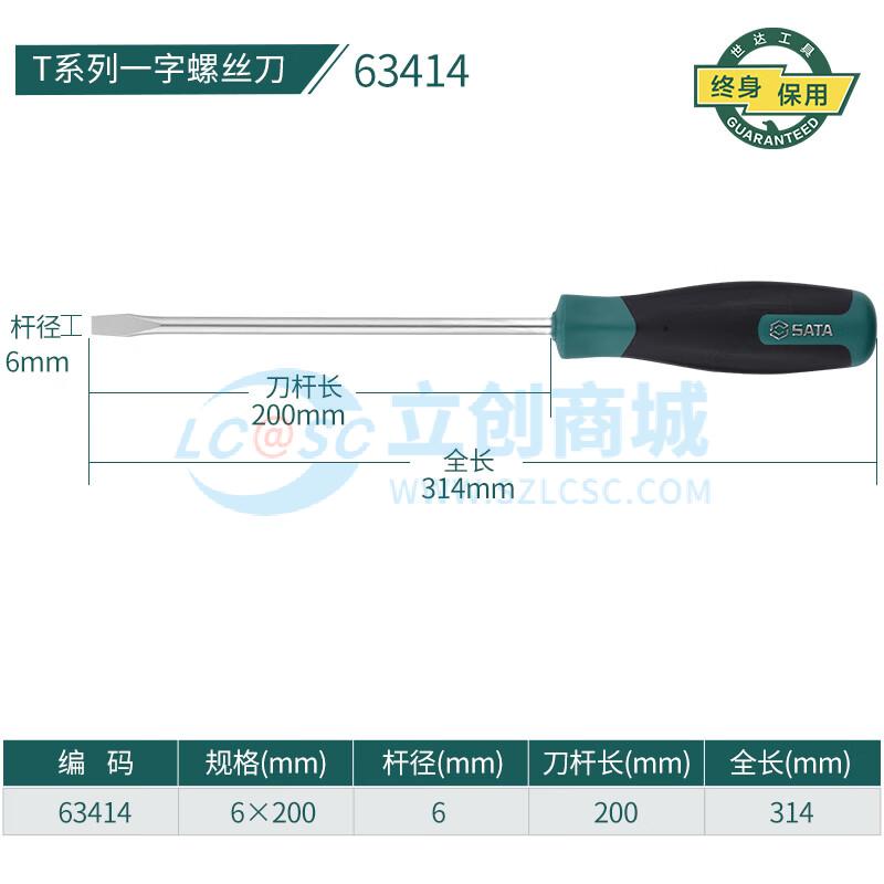 1 本款SATA(世达) T系列一字螺丝刀型号为63414,规格为6×200mm,杆径6mm,刀杆长200mm,总长314mm,适合精密电子设备及机械装配作业。