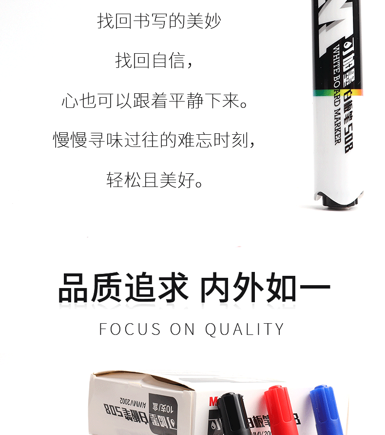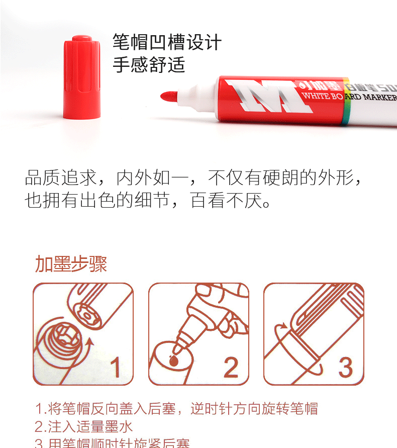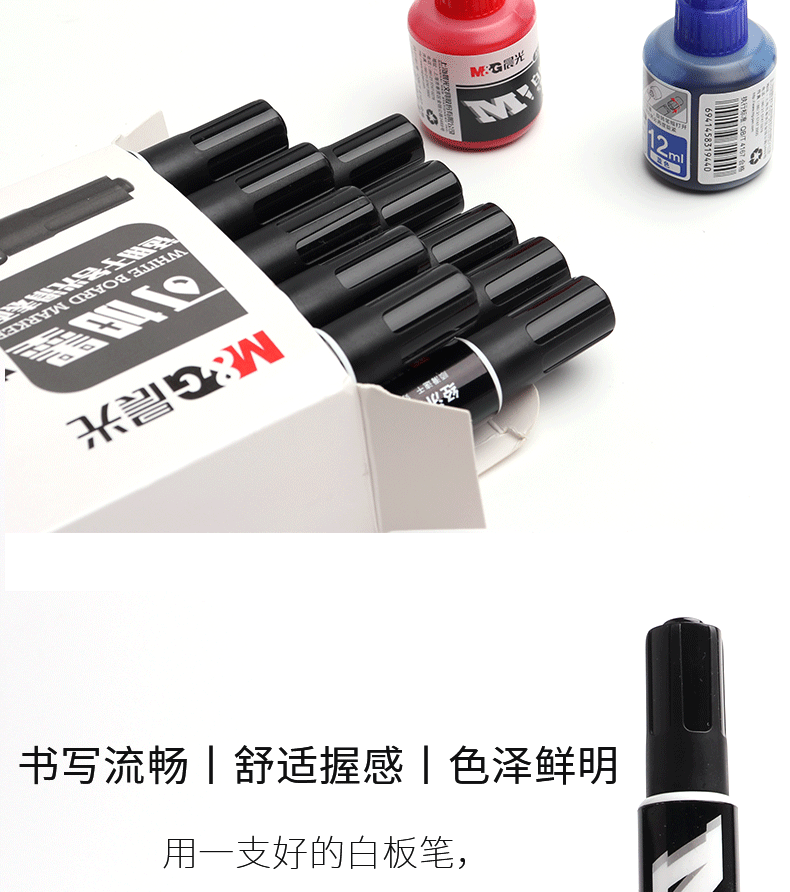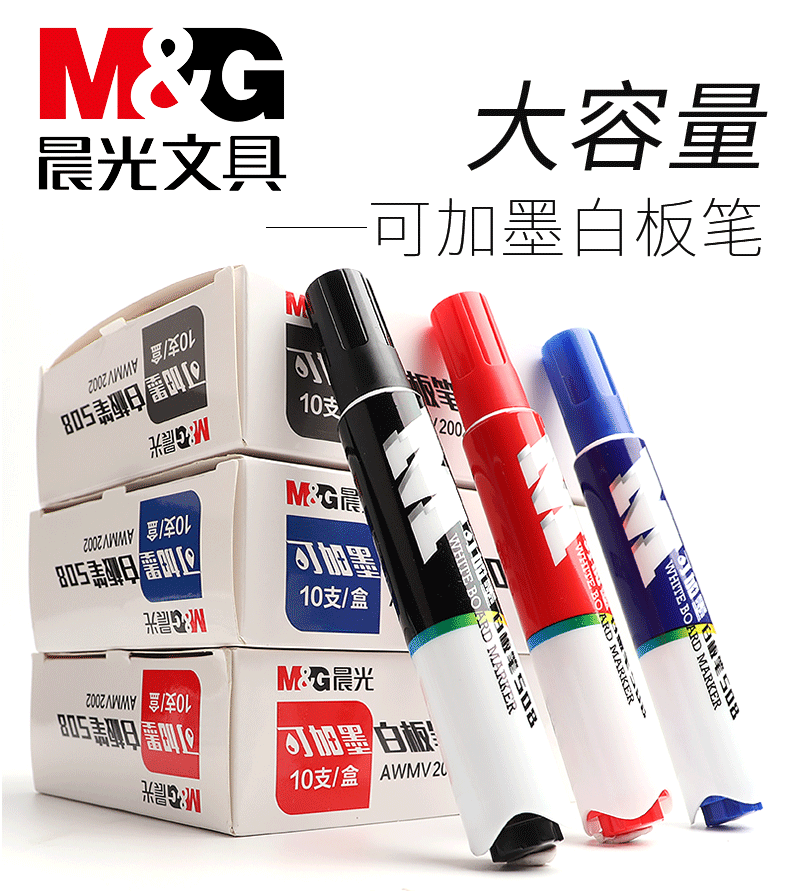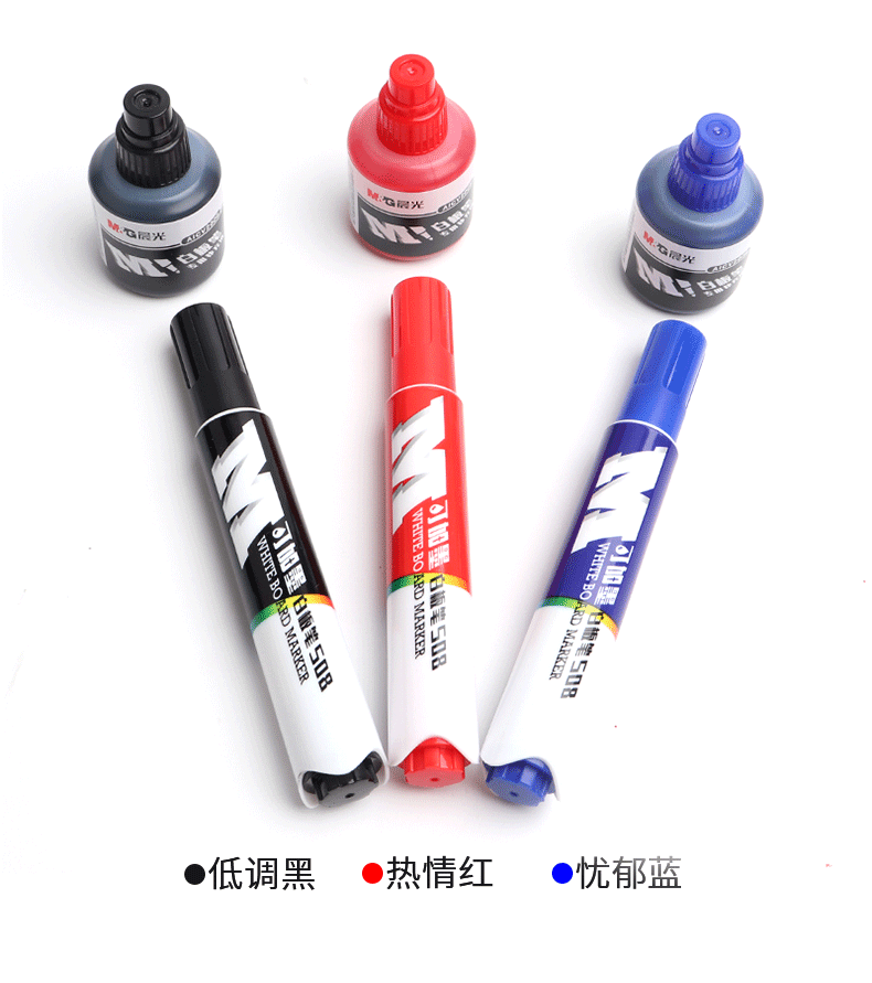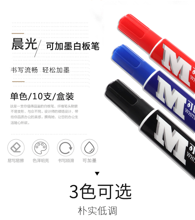 M&G晨光文具可加墨白板笔S08系列采用大容量设计,支持重复加墨使用,有效降低长期使用成本。笔头为粗头纤维材质,书写流畅顺滑,不易变形,适合在白板上进行清晰标注与书写。搭配专用墨水,可轻松完成加墨操作,使用寿命。笔身设计符合人体工学,握感舒适,笔帽设有凹槽结构,提升握持稳定性。三种颜色可选:低调黑、热情红、忧郁蓝,色彩鲜艳饱满,书写痕迹清晰可见。笔尖出墨均匀,干速适中,配合白板擦拭工具可轻松擦除,不留残痕,实现高效清洁与重复使用。