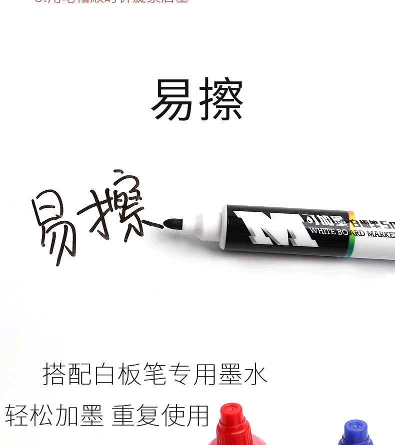 3 请使用配套的白板笔专用墨水,不可混用其他类型墨水,以免造成堵塞或损坏笔芯。