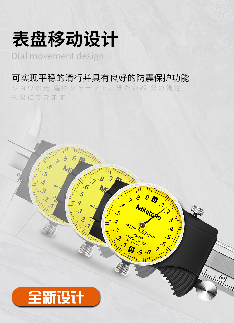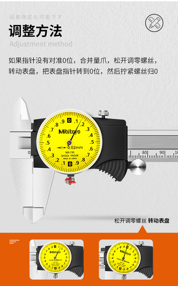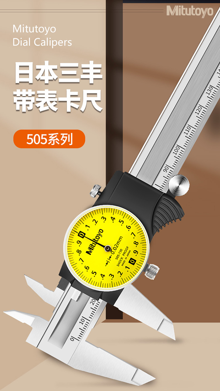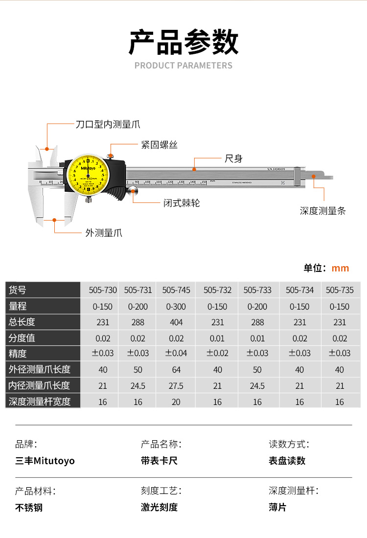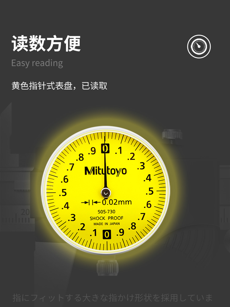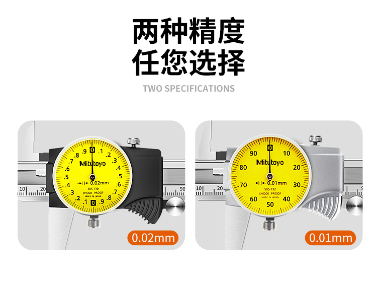 1 **高精度测量**:Mitutoyo 505-733不锈钢带表式游标卡尺提供0.01mm和0.02mm两种精度选择,确保测量的准确性。