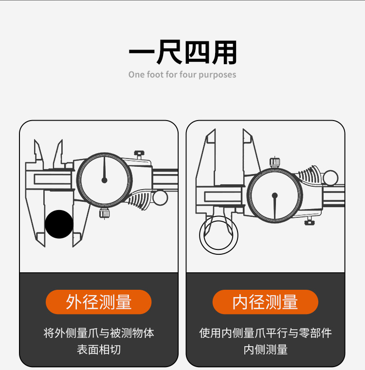 2 **多功能设计**:一尺四用,支持外径测量、内径测量、台阶测量和深度测量,满足多种测量需求。