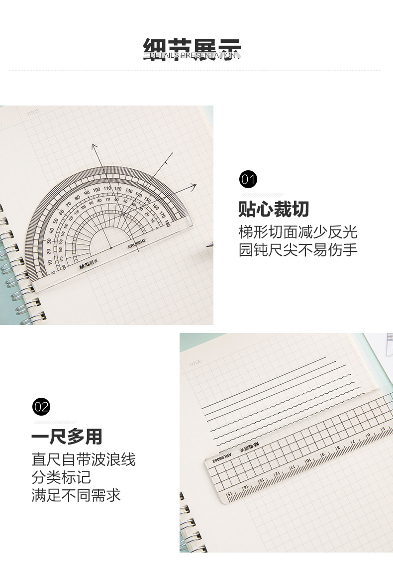 | 内含件数 | 15cm直尺×1 ;45°直角三角尺×1 ;60°直角三角尺×1 ;量角器×1 |