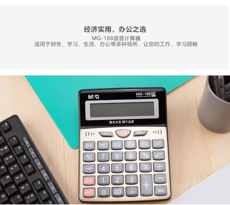 本款M&G(晨光文具)ADG98137型号计算器采用金属面板设计,外观高端大气,兼具耐用性与美观性。配备12位大屏幕显示,数字清晰可见,适合长时间使用场景。具备真人语音播报功能,支持单位报数、时钟闹铃等实用语音提示,操作过程更直观便捷。按键布局合理,分区明确,触感灵敏,响应迅速,提升计算效率。内置音量调节功能,可根据环境灵活调整声音大小,满足不同使用需求。底部设有防滑脚垫,确保放置稳定,避免滑动或倾倒。整体尺寸为145×184×47mm,适配标准办公桌面空间,采用7号电池供电(需2节),更换方便,续航可靠。该产品延续了晨光文具一贯的高品质工艺标准,从模具开发到工业设计均经过严格把控,保障产品稳定性与使用寿命。