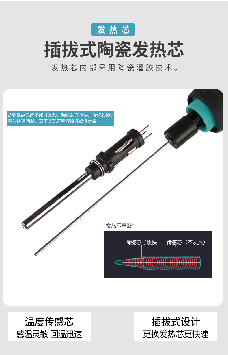 插拔式陶瓷发热芯:内部采用陶瓷灌胶技术,导热快,热损失少,更换方便,延长使用寿命。