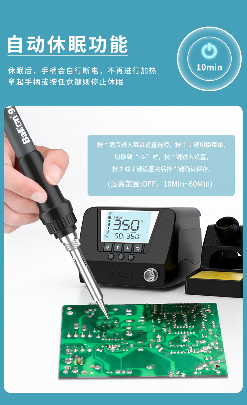 自动休眠与保护功能:具备自动休眠功能,防止烙铁头氧化;同时有发热芯短路保护和传感器异常报警,确保安全使用。