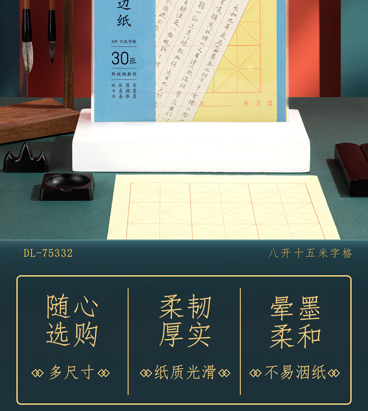 3 纸面印有十五格米字格,有助于初学者掌握字体结构和笔画布局,提升书写规范性