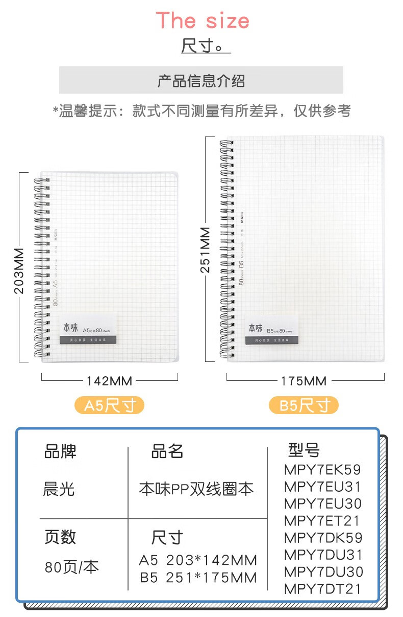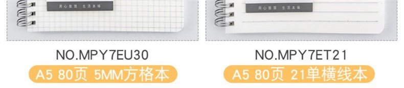 不同型号对应不同内页格式,请根据实际需求选择合适的款式(如MPY7EU31为12行英语本,MPY7EU30为5mm方格本)。