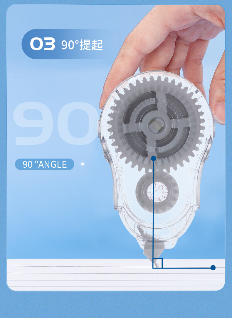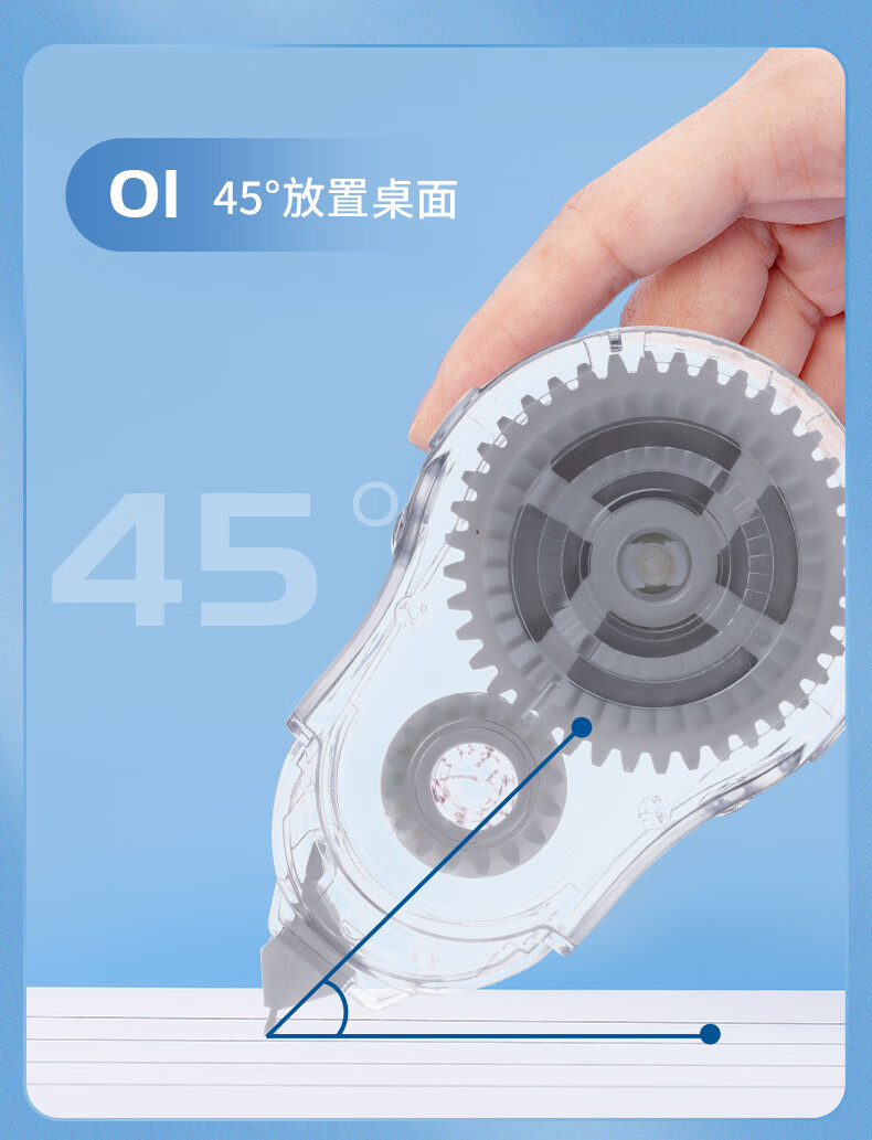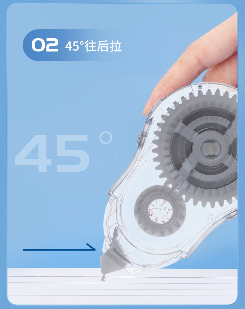 1 使用时建议以45°角轻压桌面,随后向后拉动完成涂改动作,最后垂直提起,避免拉扯过猛导致断带。