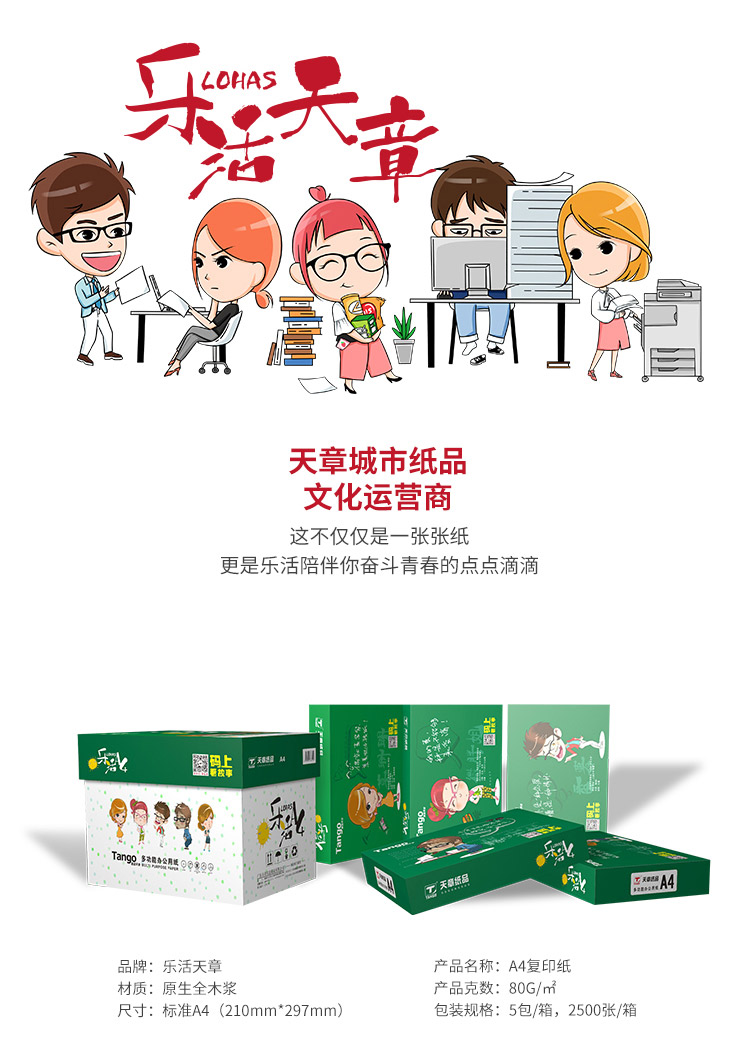 乐活天章80克A5复印纸采用原生全木浆制成,具有良好的白度和均匀的纸张表面,确保打印和复印效果清晰、无斑点。