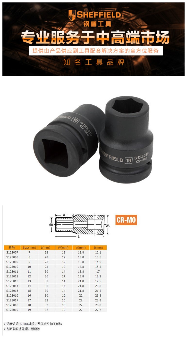 SHEFFIELD(钢盾) 3/8"系列气动公制套筒13mm(型号:S123013)具有以下特点:
