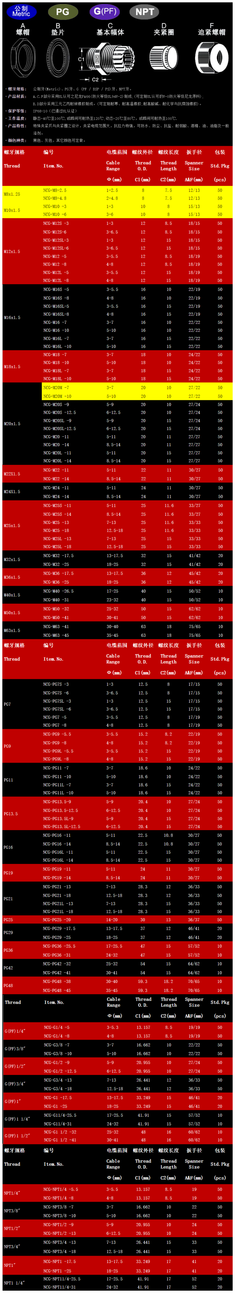 支持多种螺纹规格适配不同电缆直径,具体参数可参考产品规格表,也可定制其他颜色