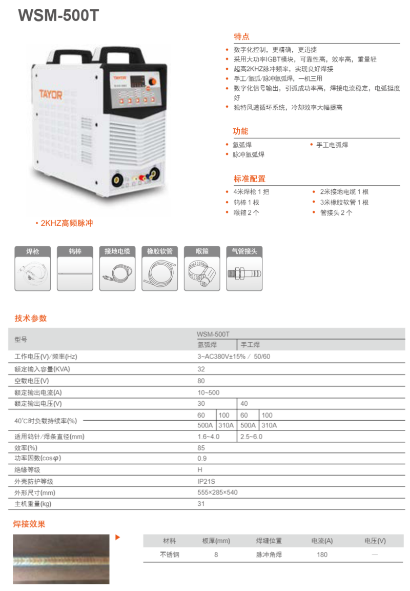 TAYOR/通用 逆变式直流氩弧焊机 WSM-500T标配 4m焊枪+2m接地电缆+钨棒×1+喉箍×2+3m橡胶软管+管接头×2 台