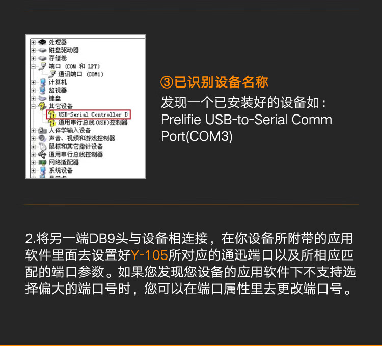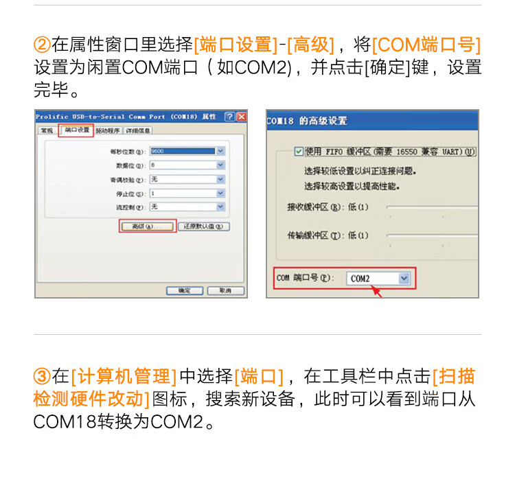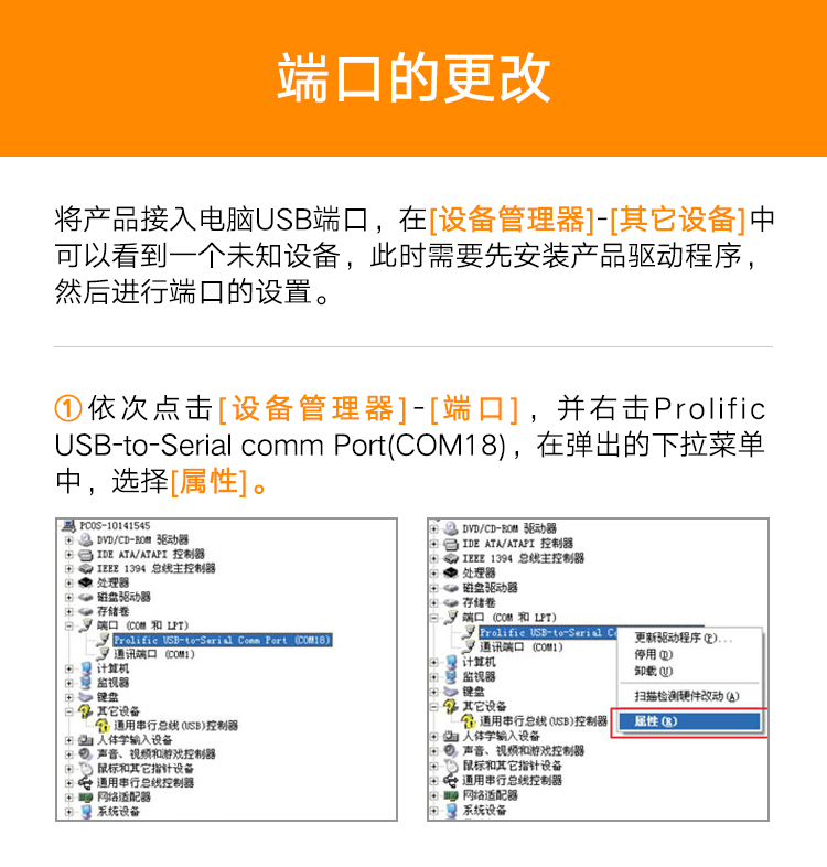 可通过设备管理器修改COM端口号,避免与其他硬件冲突,具体操作路径为:设备管理器 → 端口 → Prolific USB-to-Serial Comm Port → 属性 → 高级 → 设置COM端口号。