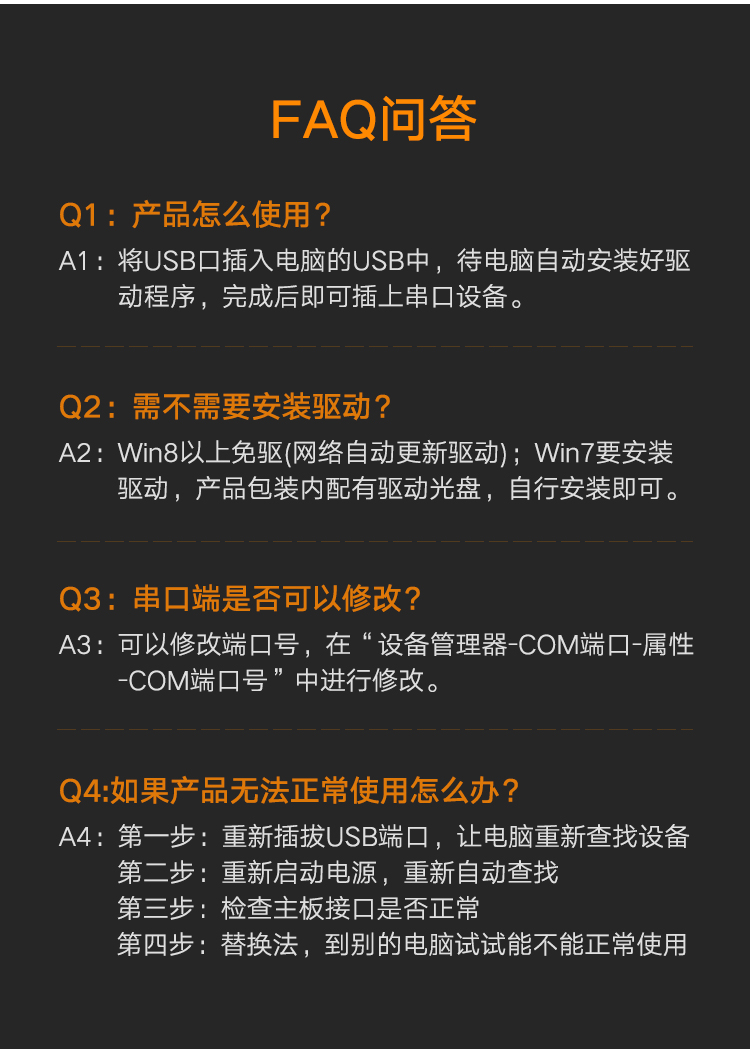 如遇无法正常使用的情况,请按以下步骤排查:重新插拔USB接口 → 重启电源 → 检查主板接口状态 → 在其他电脑上测试验证。