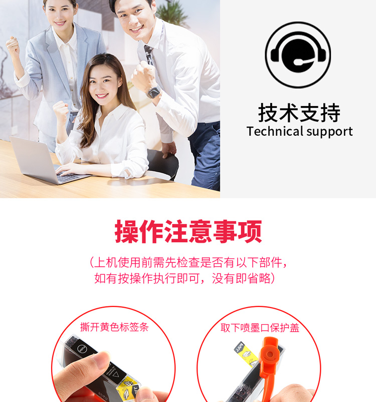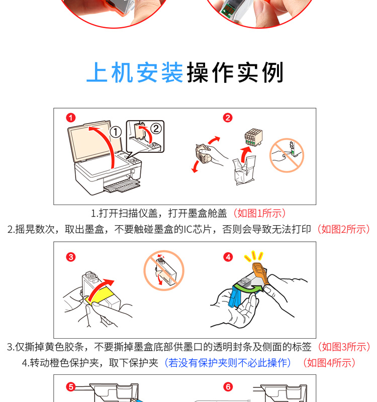 操作时仅需撕掉墨盒表面的黄色标签条,切勿撕除底部透明封条及侧面标签,以免影响供墨系统正常工作。
