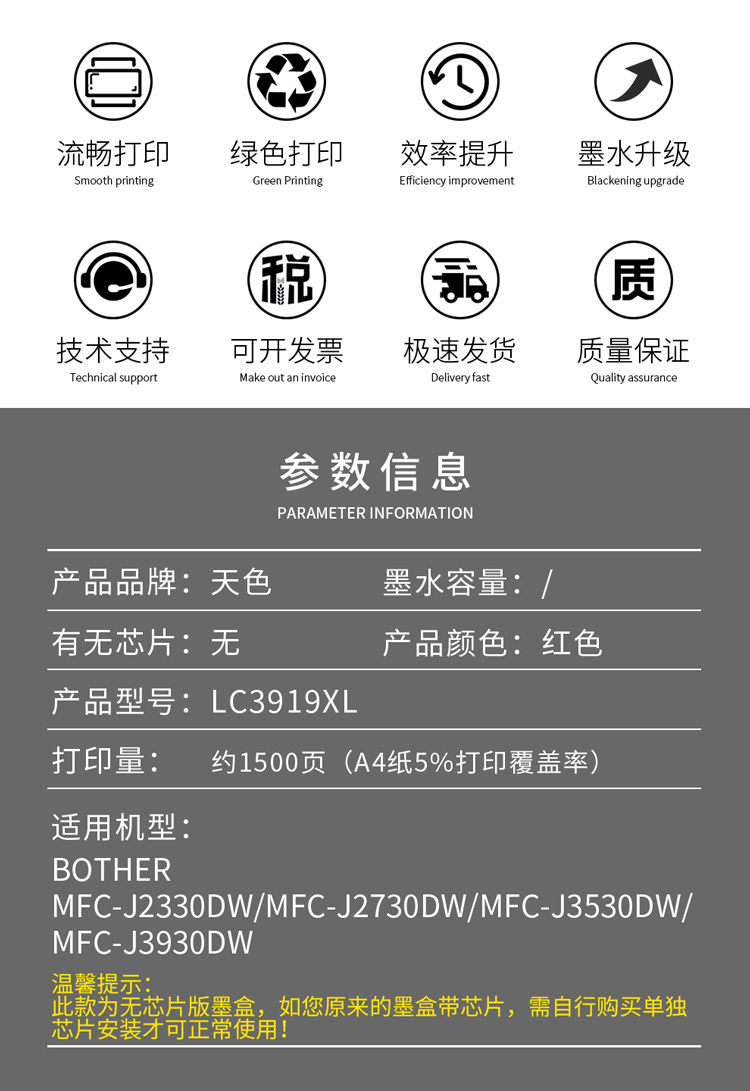 本款墨盒为无芯片版本,若原机墨盒带有芯片,请务必自行购买并安装单独芯片,否则可能无法正常识别和打印。
