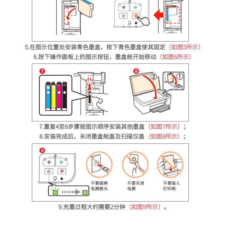 安装完成后,需等待约2分钟完成充墨过程,期间请勿拔掉电源插头、关闭电源或装入打印纸。