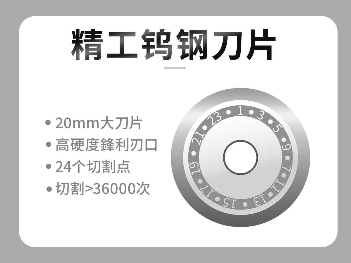 内置精工钨钢刀片,直径达20mm,具备24个切割点,硬度高、刃口锋利,单片刀片寿命超过36,000次切割,大幅降低维护成本。