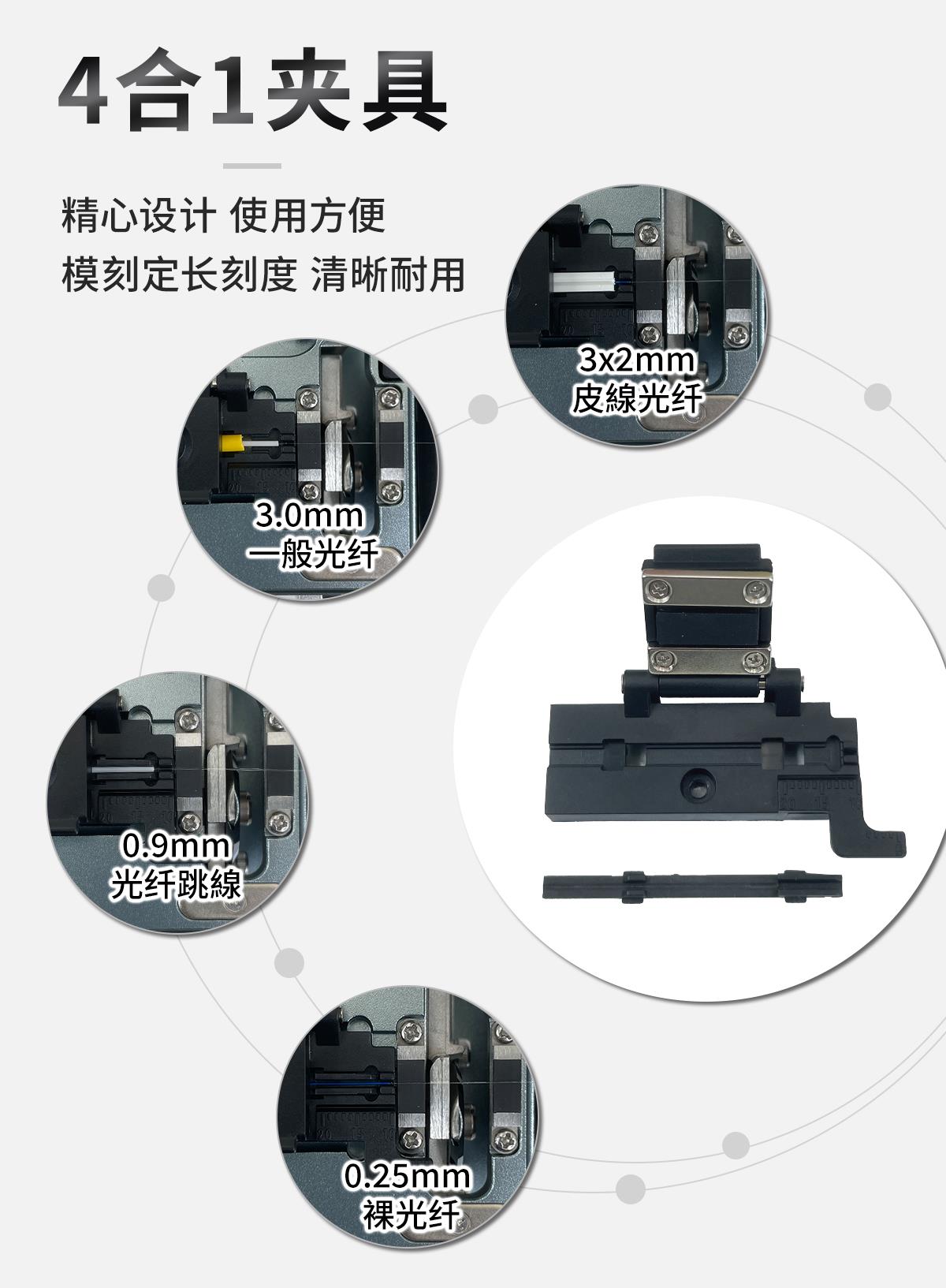 配备4合1夹具设计,兼容多种光纤类型,包括0.25mm裸光纤、0.9mm光纤跳线、3.0mm一般光纤及3x2mm皮线光纤,满足不同应用场景需求。