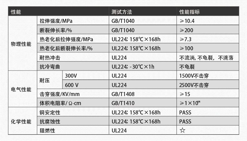 电气性能:耐压性能优异,300V规格1500V 1min不击穿,600V规格2500V 1min不击穿;击穿强度≥15KV/mm,体积电阻率≥1×10¹⁴Ω•cm,绝缘性能佳。