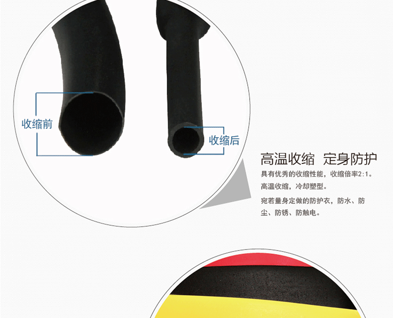 3 收缩性能优异:起始收缩温度70℃,超薄型完全收缩温度110℃,普通型完全收缩温度125℃,收缩率2:1,加热后可紧密收缩包裹被保护物,实现防水、防尘、防锈、防触电的防护效果