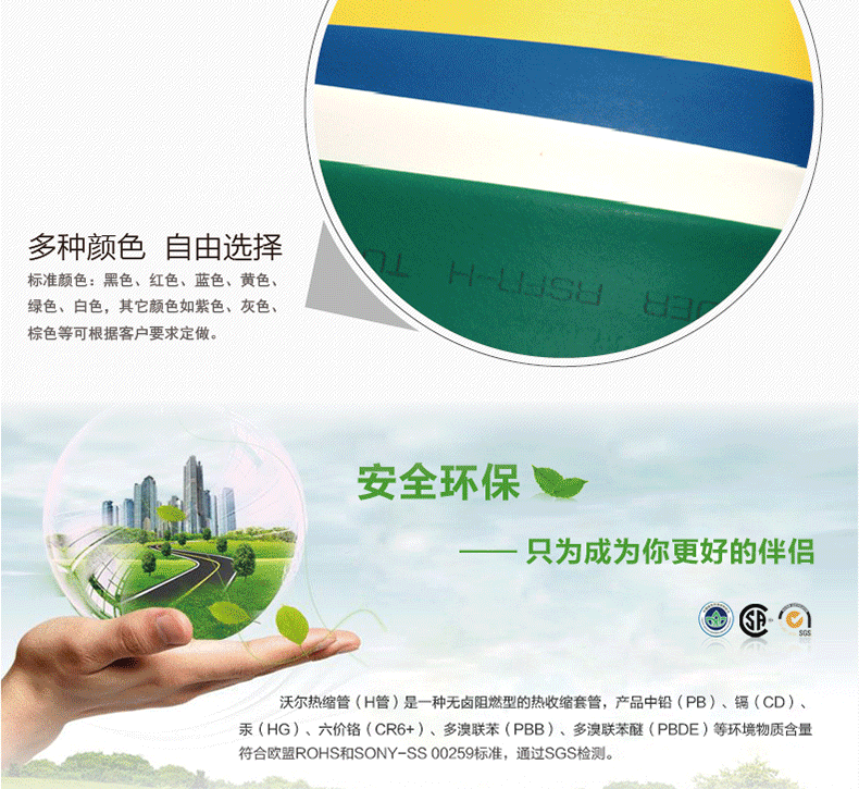 1 材质环保:采用无卤环保阻燃的辐照交联聚烯烃材料,不含铅、镉、汞、六价铬、多溴联苯(PBB)、多溴联苯醚(PBDE)及卤素等有害物质,通过SGS、SONY - SS - 00259、REACH、RoHS2.0等环保检测,满足严格环保要求