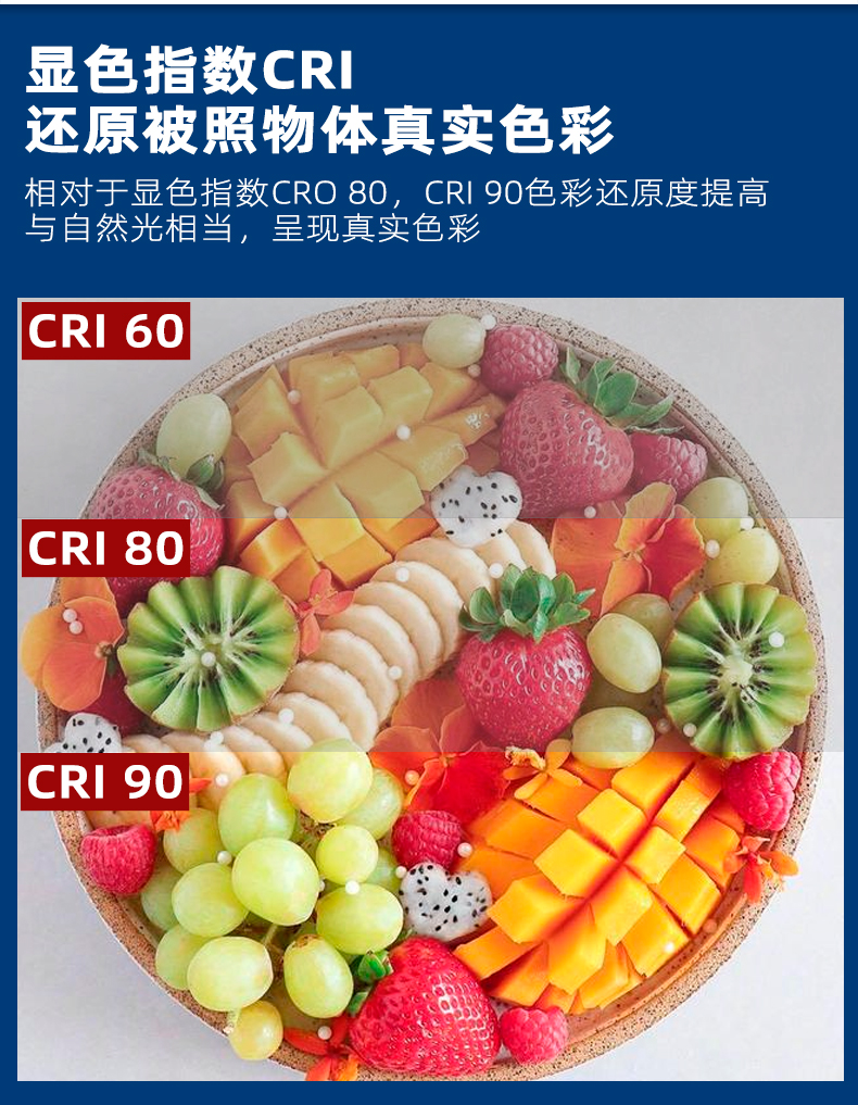 显色表现:显色指数达CRI 90级别,高度还原被照物体真实色彩,视觉效果接近自然光,适配阅读、商品展示、手工操作等对色彩还原要求高的场景。