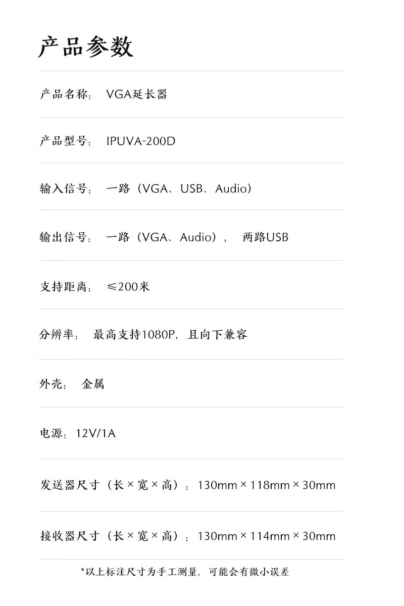 设备尺寸紧凑,发送器为130mm×118mm×30mm,接收器为130mm×114mm×30mm,便于安装在机柜或桌面环境中;