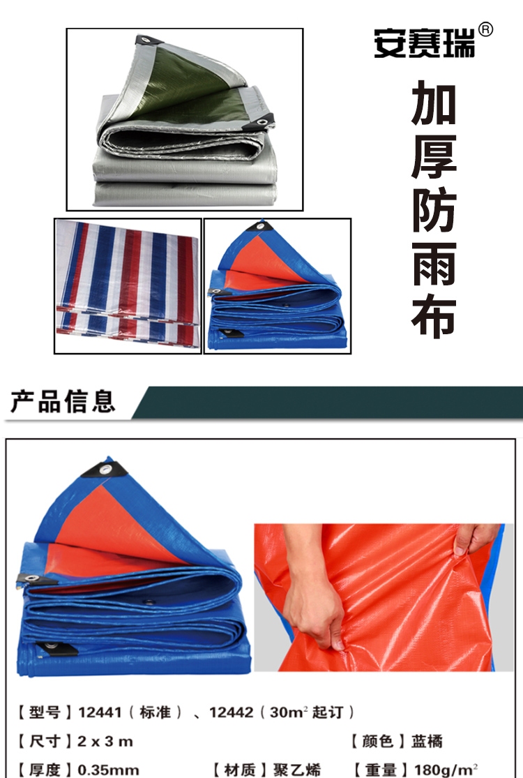 安赛瑞加厚防雨布采用PE聚乙烯材质,厚度为0.35mm,具有优异的防水性能,能够有效防止雨水渗透。立体包边设计,边缘加粗尼龙绳,美观且结实耐用,延长了产品的使用寿命。热合折边工艺确保了布料的平整和耐用性,避免了传统缝合方式带来的开裂问题。双面防水特性使得该防雨布在各种天气条件下都能保持良好的防水效果。金属扣眼设计在四条边和角处,方便固定,结实耐用,适合多种应用场景。整体重量为180g/m²,轻便易携,便于安装和搬运。
