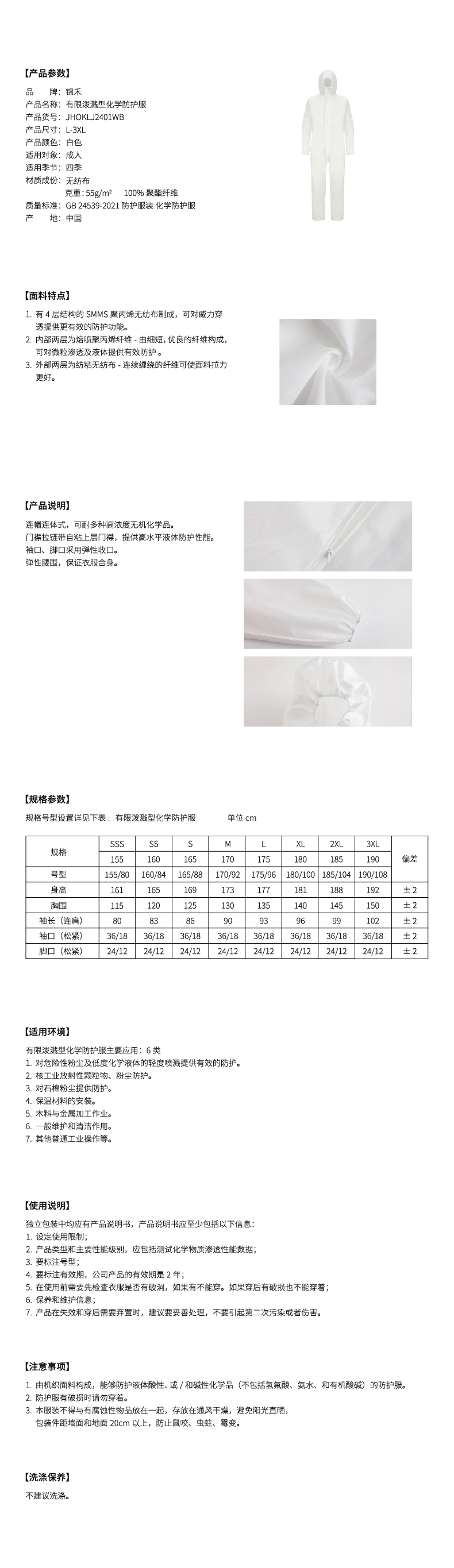JINHE(锦禾)品牌JHOKLJ2401WB-3XL型号有限泼溅型化学防护服,采用4层结构SMS聚丙烯无纺布制成,具备优异抗穿刺性能,有效防护外部微粒渗透及液体泼溅