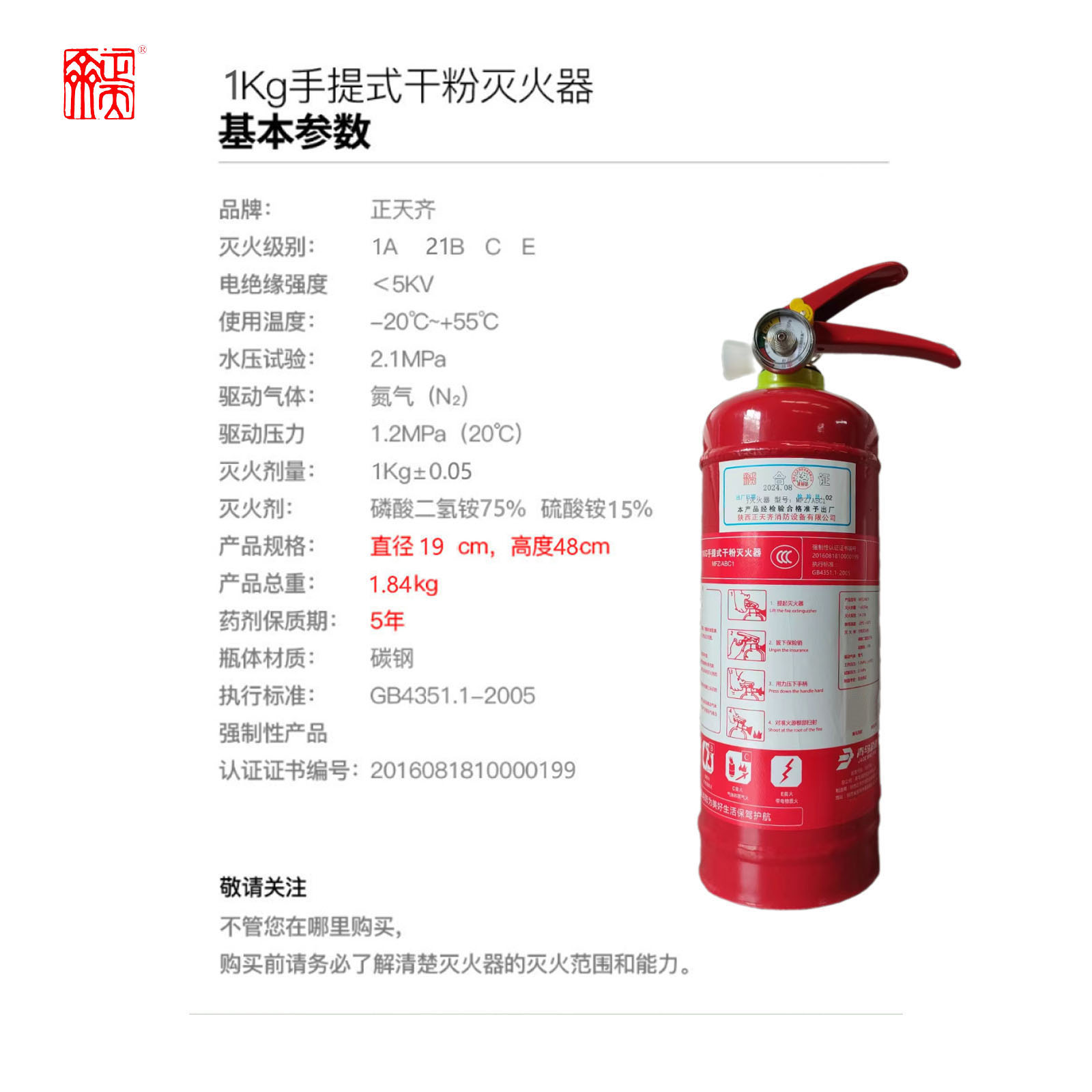 ZTQ(正天齐)MFZ/ABC1手提式干粉灭火器车载家用消防器材1公斤