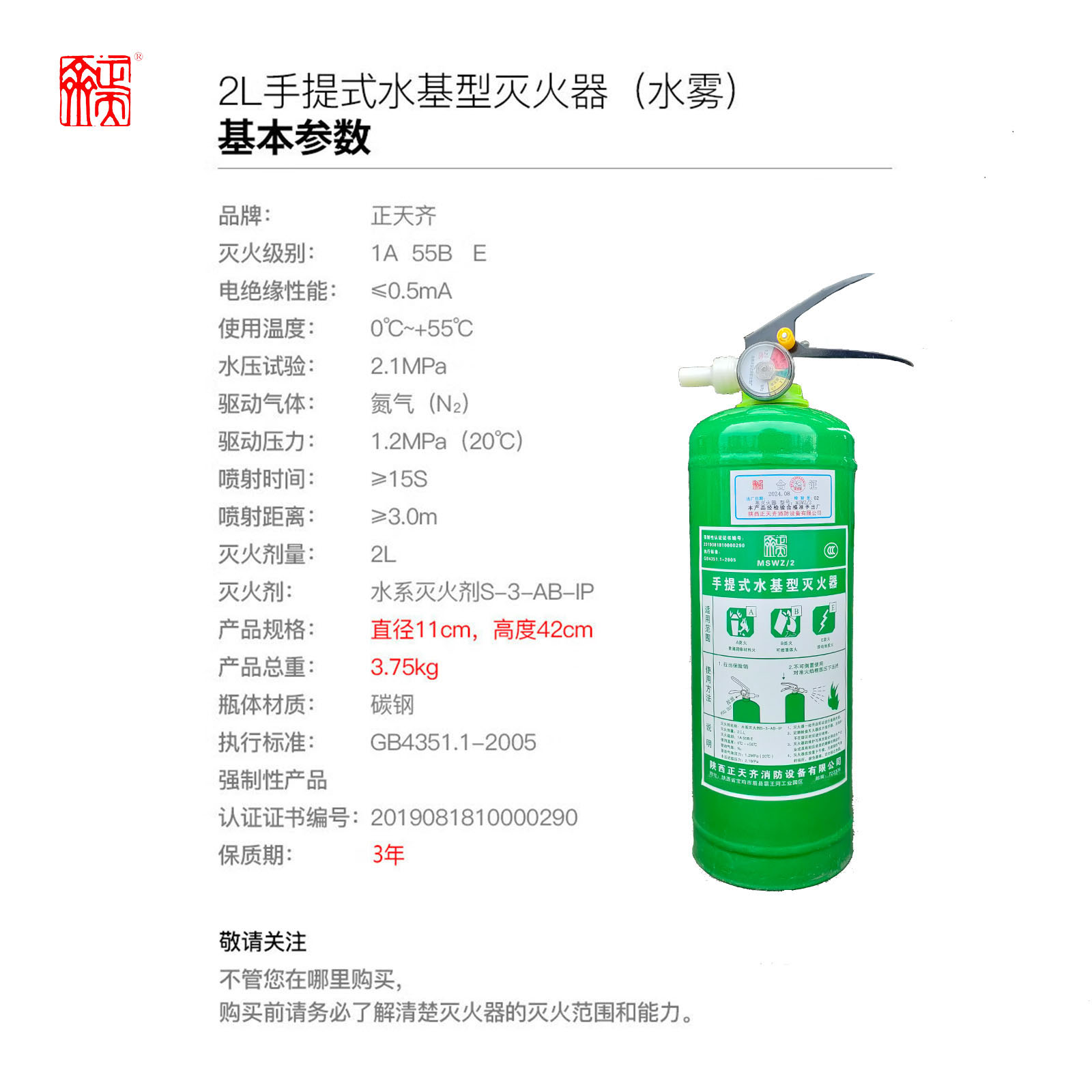 ZTQ(正天齐)MSWZ/2手提式水基灭火器车载商用家用消防器材2L