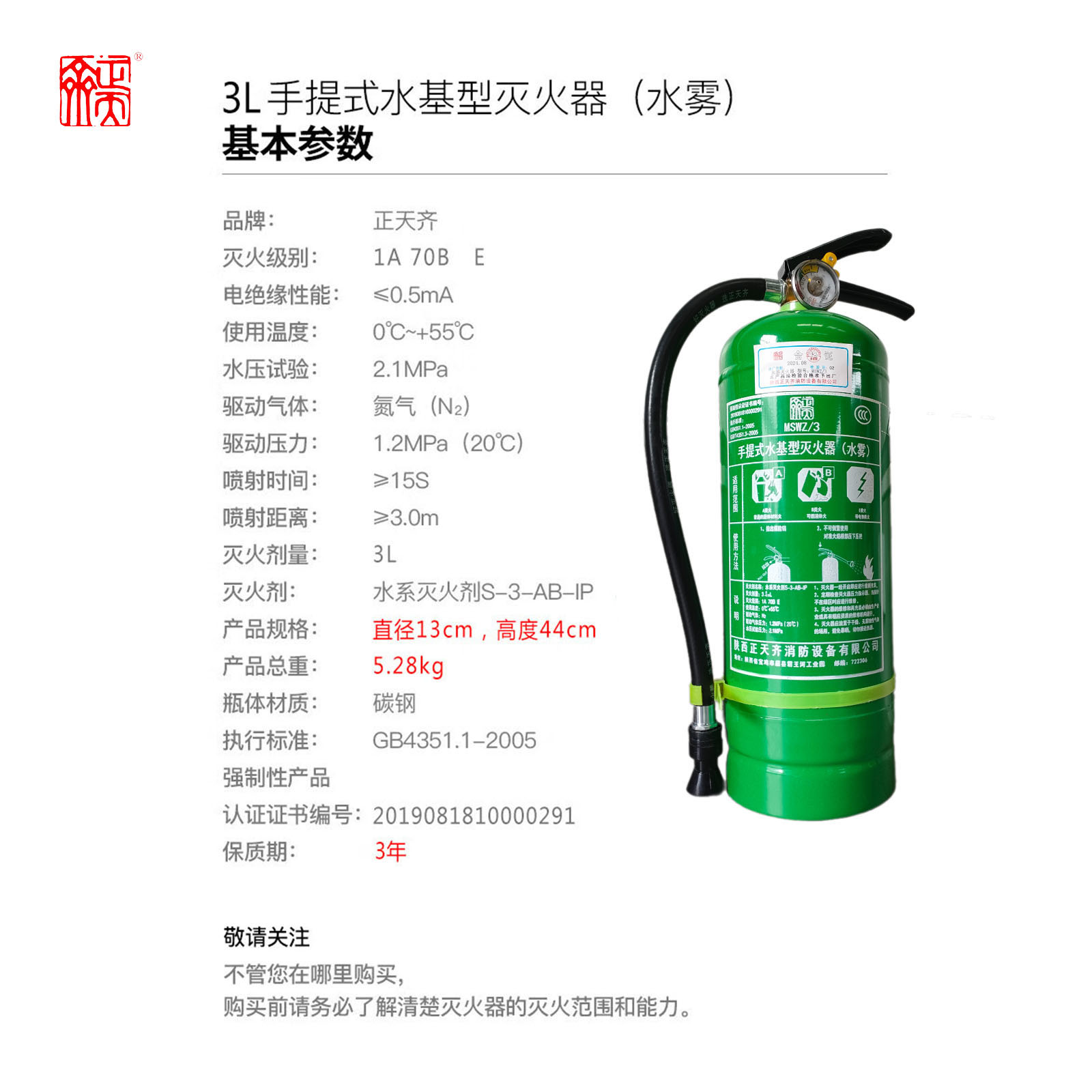 ZTQ(正天齐)MSWZ/3手提式水基灭火器车载商用家用消防器材3L