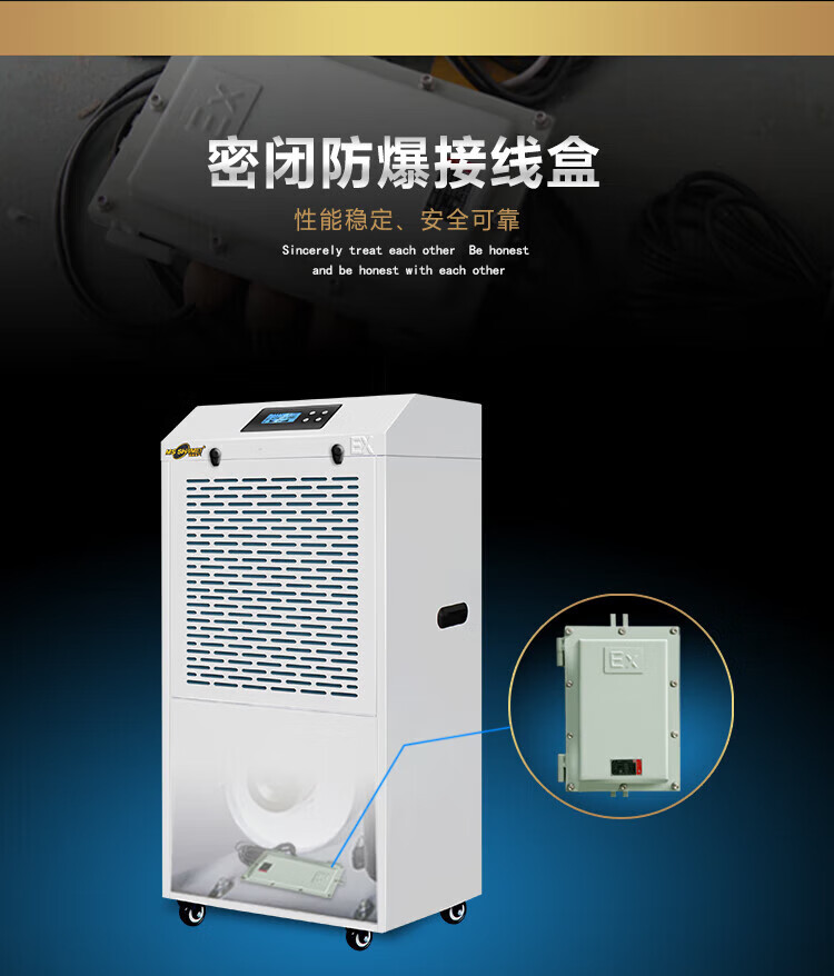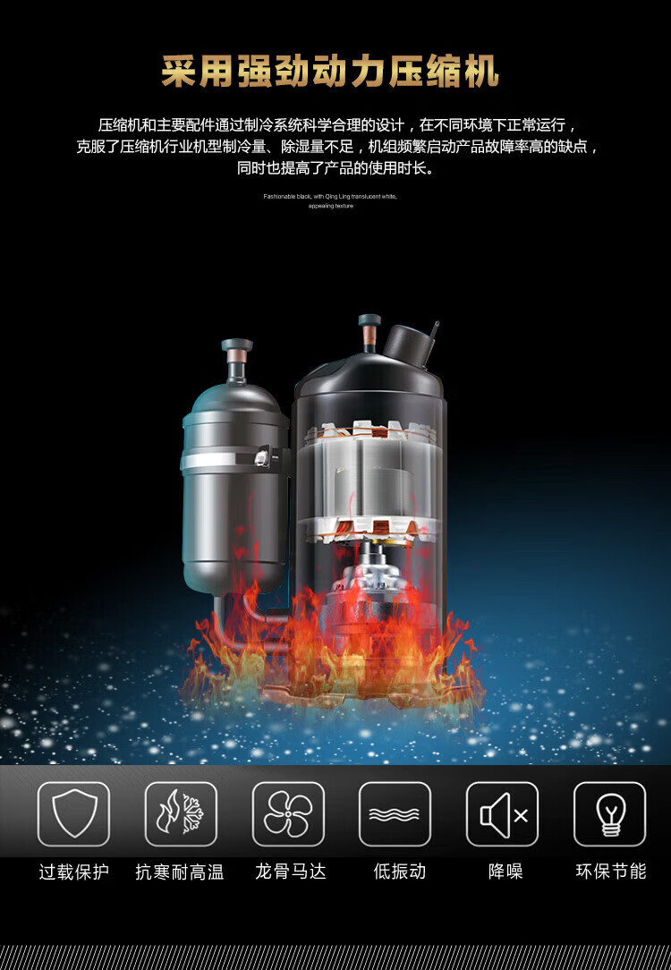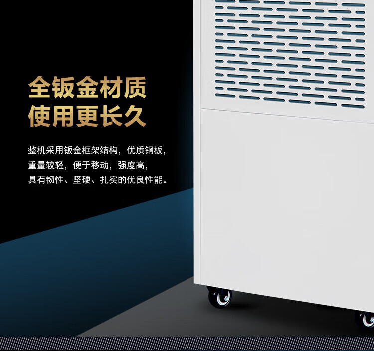 核心部件:配备强劲动力压缩机,抗寒耐高温,低振动降噪;蒸发器/冷凝器采用0.1mm亲水铝箔材料+内螺纹铜管,高效换热提升除湿效率