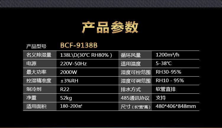 高效除湿:名义除湿量138L/D(30℃ RH80%),适用面积180-200㎡,循环风量1200m³/h,控湿精准度±3%RH,湿度可控范围RH30-95%