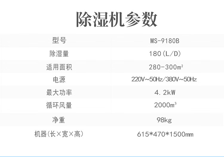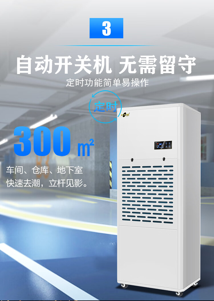 1 除湿能力强劲:日除湿量180L/D,适用面积280-300㎡,满足大面积空间防潮需求