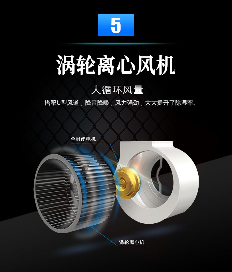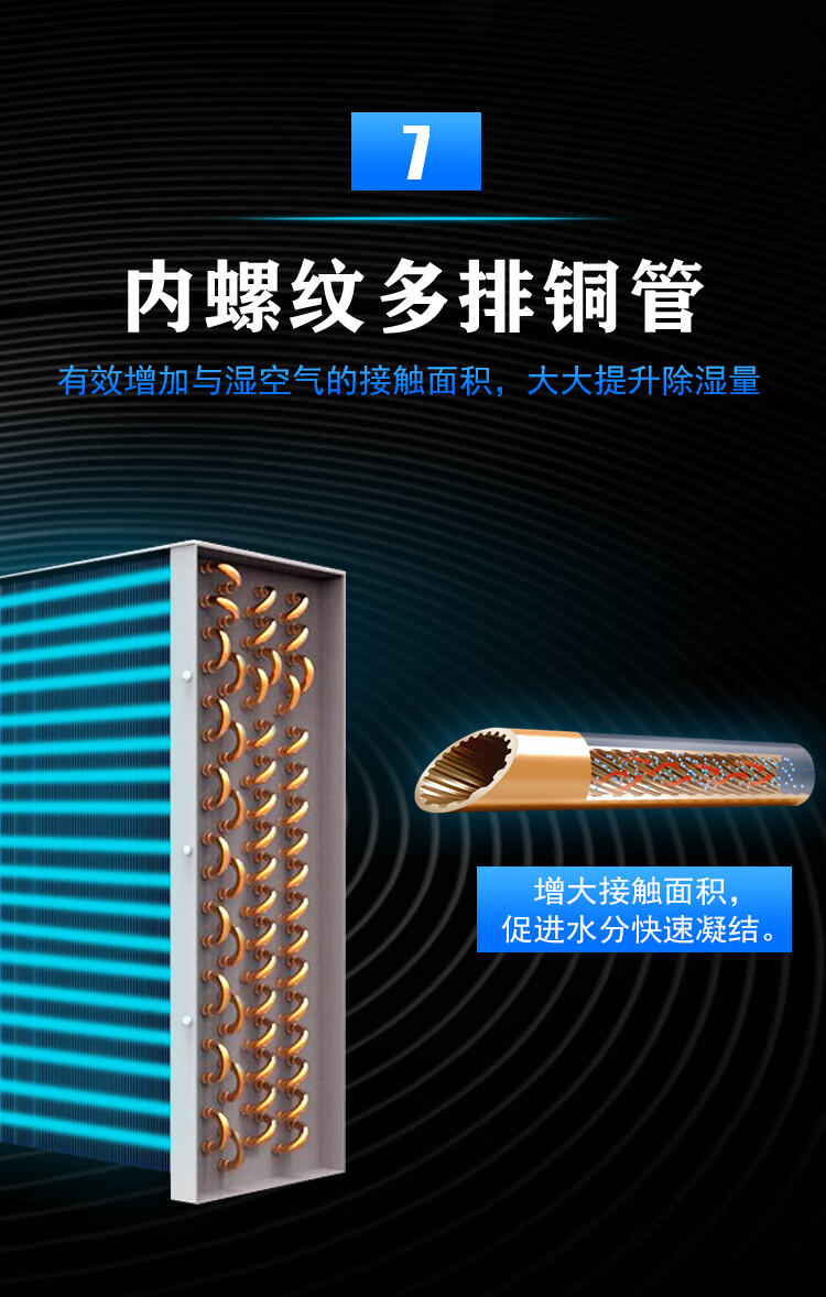 5 高效核心部件:采用品牌压缩机(过载保护、抗寒耐高温)、涡轮离心风机(大循环风量、降音降噪)、内螺纹多排铜管(增大接触面积提升除湿量)