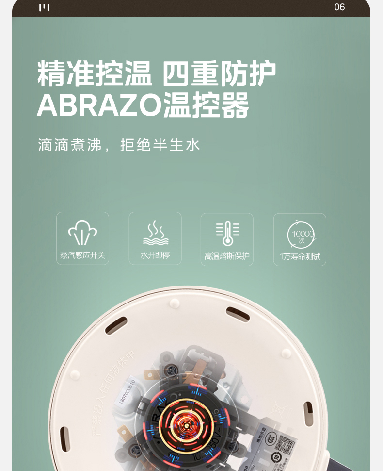 **ABRAZO温控器**:精准控温,四重防护(蒸汽感应开关、水开即停、高温熔断保护、1万次寿命测试),确保使用安全。