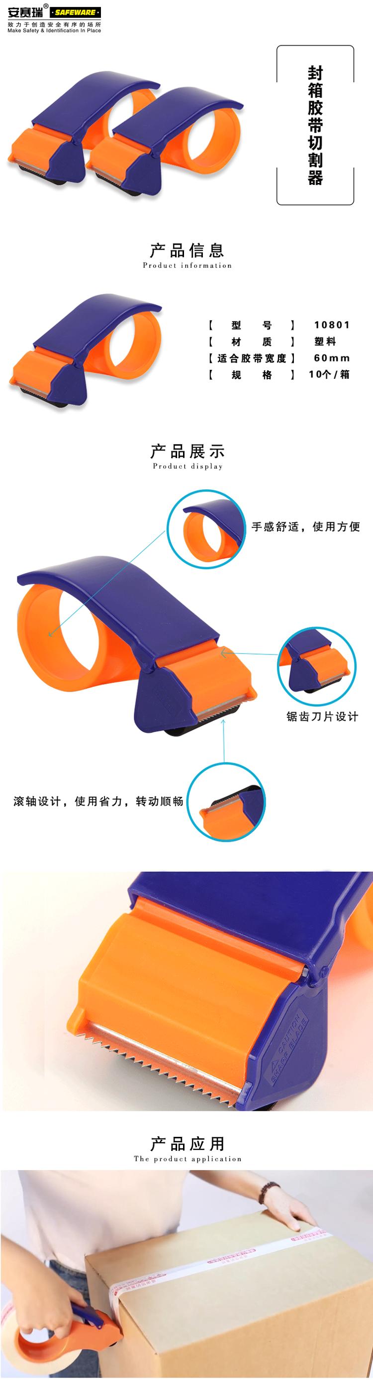 该封箱胶带切割器广泛应用于仓储物流、快递分拣、电商打包、工厂包装等需要频繁封箱的作业环境。特别适合在快节奏的包裹处理流程中使用,如快递站点、电商仓库、超市配送中心等。其小巧轻便的设计便于随身携带,可在工作台、移动推车或货架旁随时取用,提高工作效率。同时适用于办公室文具整理、小型物品封装等日常场景,是提升包装作业标准化和效率的理想工具。