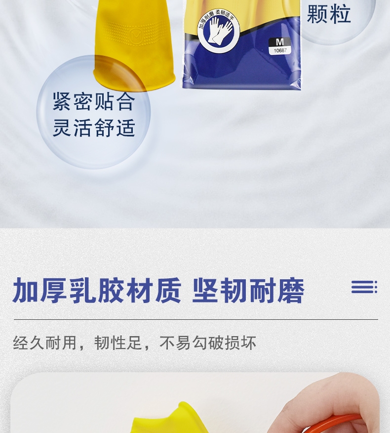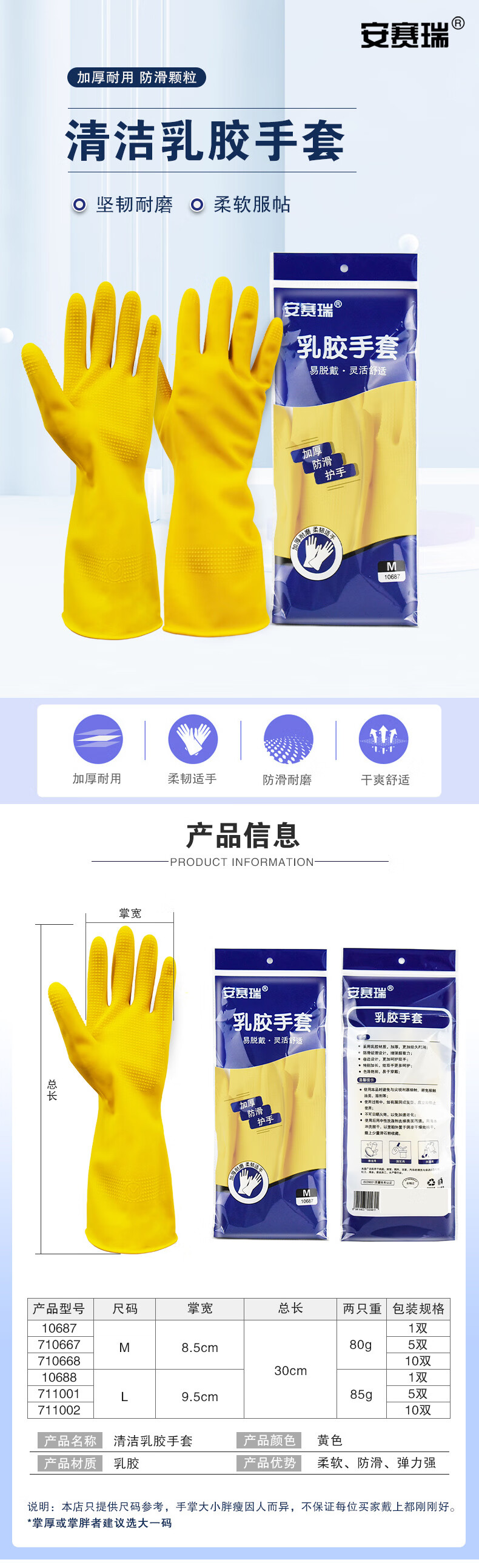 1 加厚乳胶材质:采用优质乳胶制成,厚度适中,确保手套坚韧耐磨,延长使用寿命。